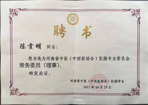 陈贡明、男、1956年6月出生,现任河南省虞城县第二人民医院肛肠科主任,大专学历,从事肛肠病专业50余年,毕业干商丘医专、河南郑州仲景医专。先后进修于商丘市第一人民医院、开封市第一中医院、北京中国中医药研究院肛肠专科各进修一年。发表国家、省级论文七篇江肠科书籍主编副主编多篇,可然练开展肛肠科多项手术,如内外痔疮、肛裂肛瘘、肛周脓肿、直肠粘膜脱垂、便秘、溃疡性结肠炎等,均有自己的独特治疗方法。以最小痛苦得致最好的效果,得到患者的认可。曾被全国中医中西医结合学会推选为全国第五、六届理事,第六届常务理事,河南省肛肠学会常委委员,河南省肛肠学科知名专家,商丘市肚肠学会常务委员,肛肠学科知名专家,虚城县五一劳动者奖章。