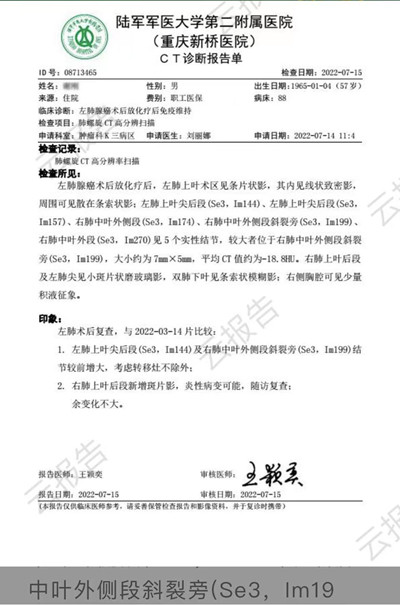 此晚期肺癌患者,在新桥医院化疗三年,花费一百多万,与他一同化疗的8人已经死亡7人,使用雅来安修护液时已经不能平躺睡觉,咳嗽不止,面潮红低烧,自感不治,现使用雅来安修护液200瓶已经痊愈。